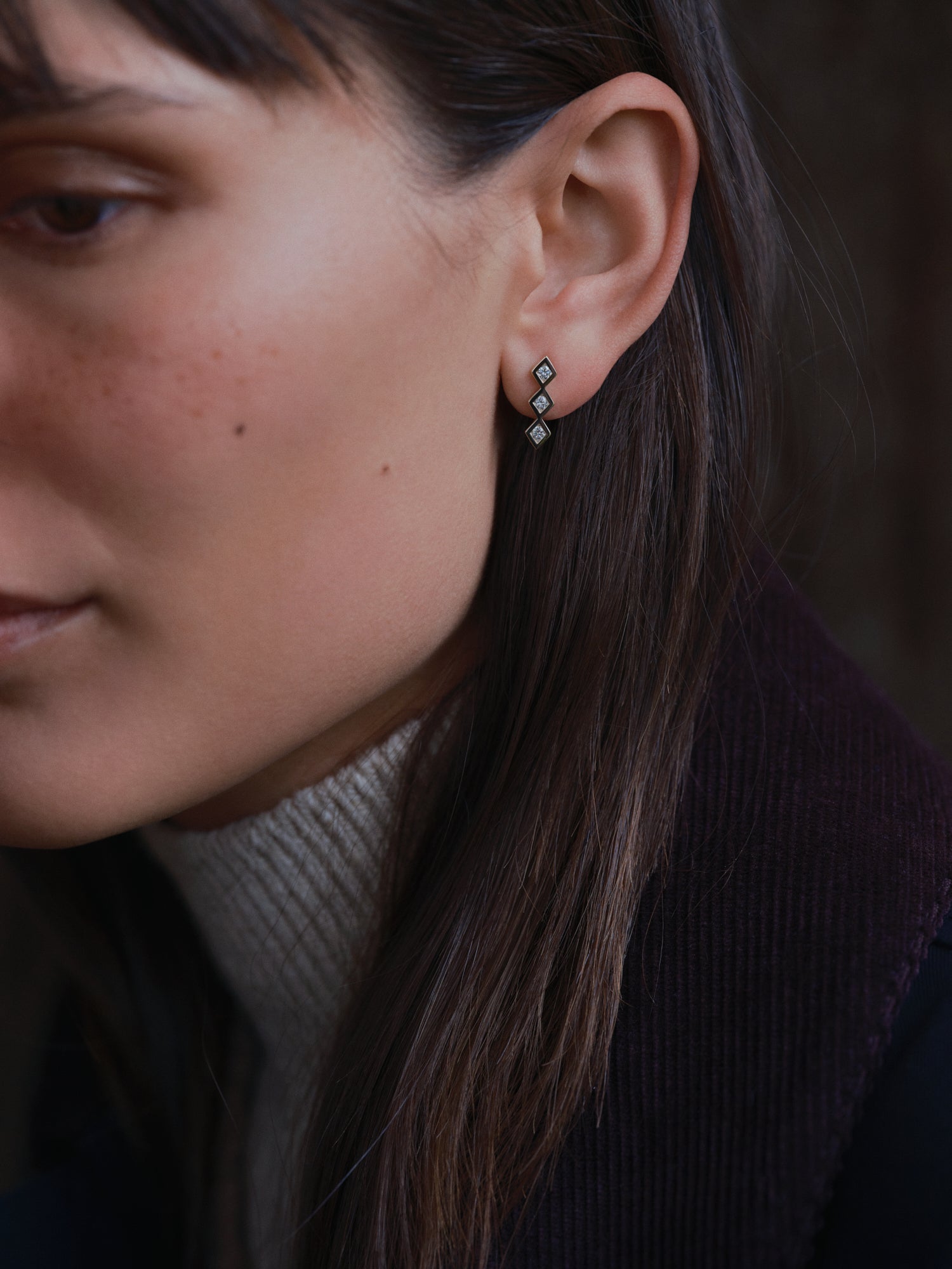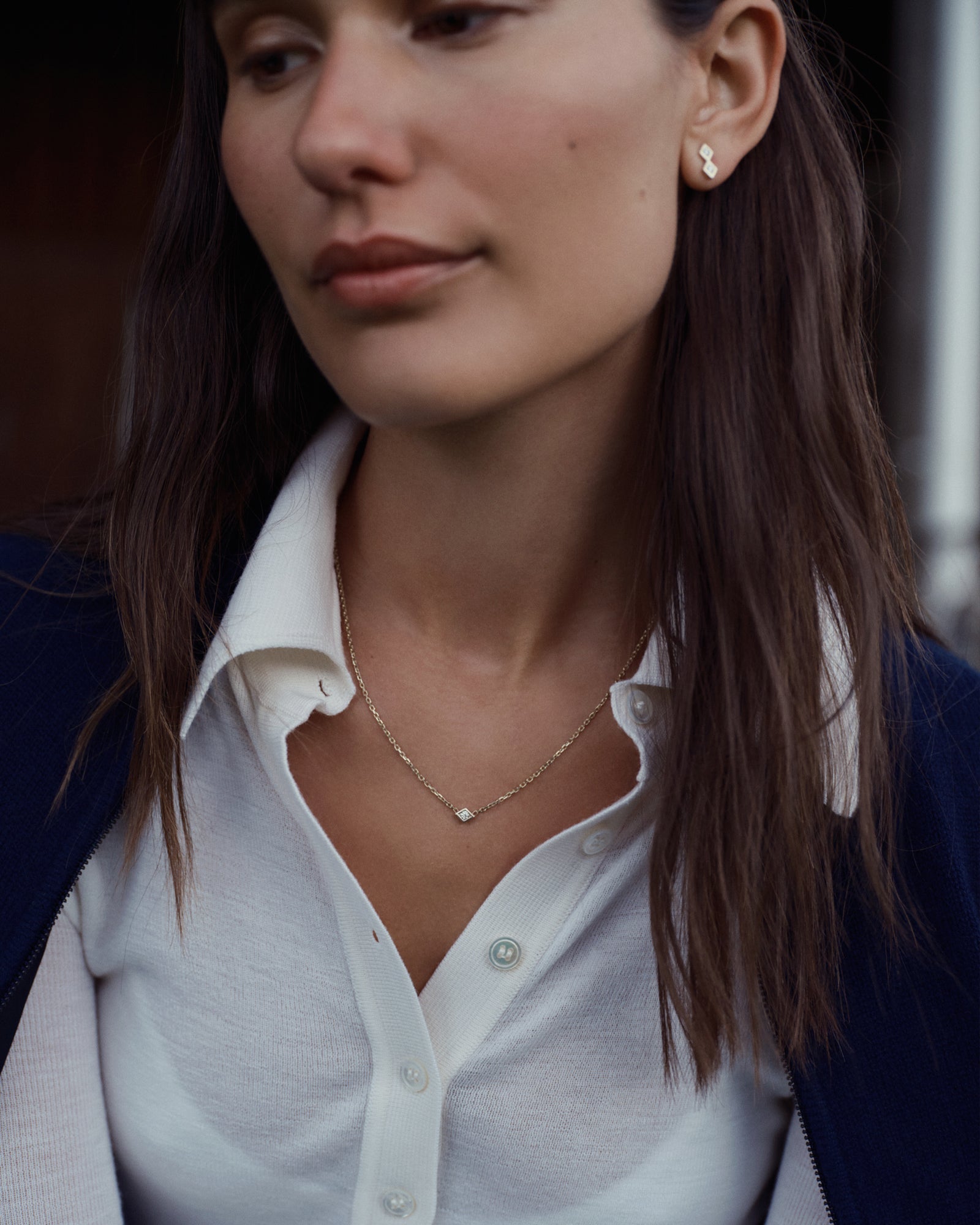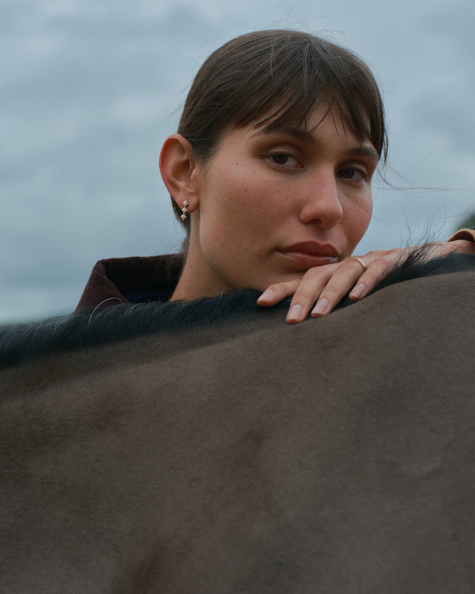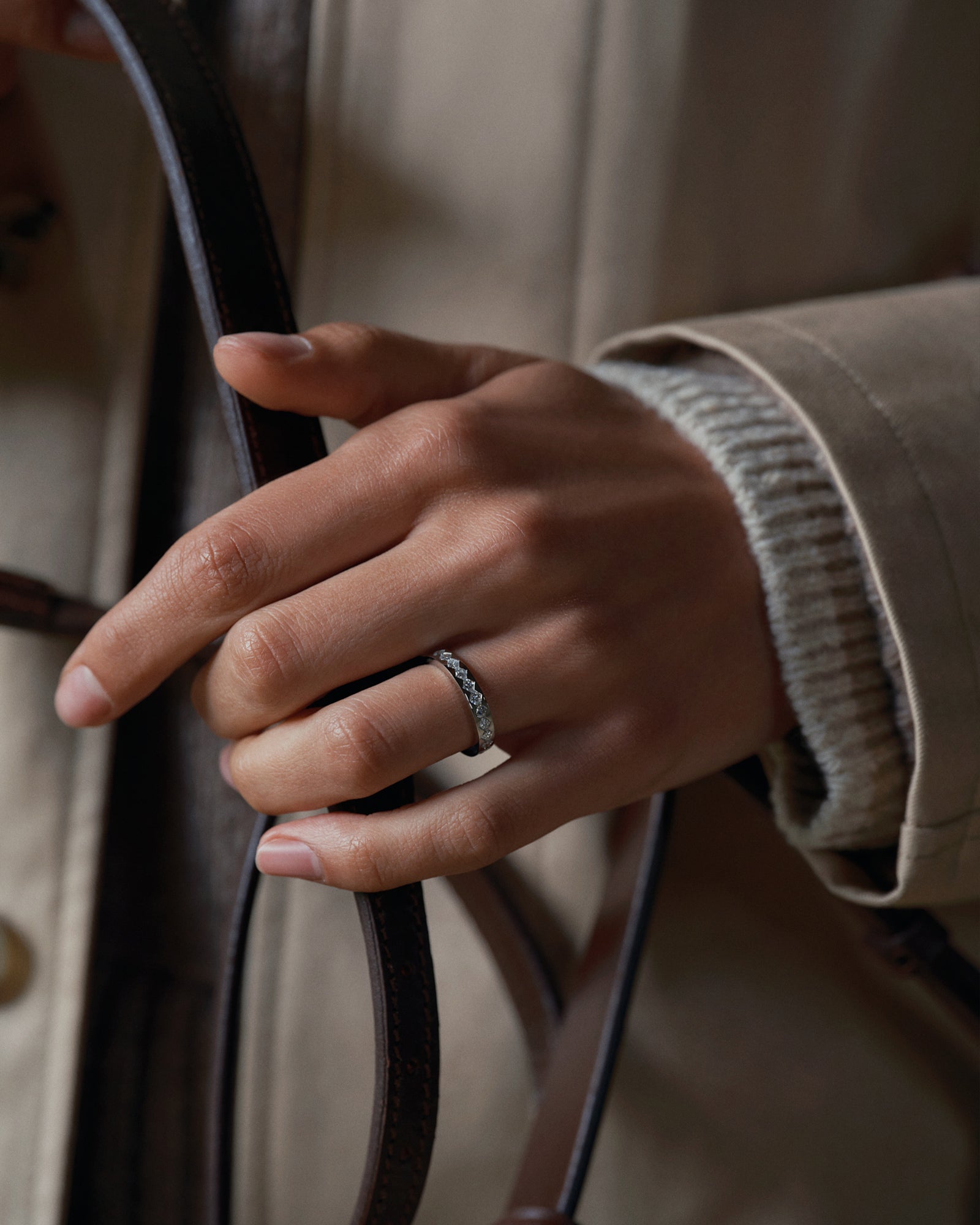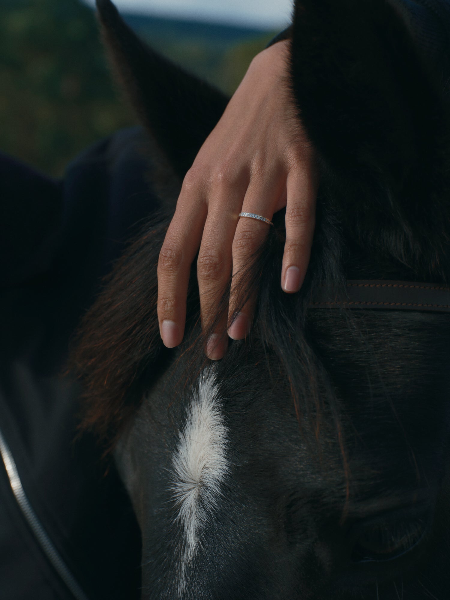 Reminiscent of equestrian utility and routine, patterns reveal the poise in between movements. A measured path is documented in a distinct combination of decisions. A zig-zag references intention and commitment to a new way forward. In line with this, Hamish uses a signature setting to uniform and simplify the geometry of the stones, drawing focus to utility, graphic subtlety and pattern.